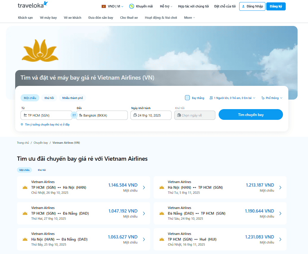 Trong thời điểm nhu cầu du lịch tăng mạnh, việc săn vé bay giá rẻ từ một hãng lớn như Vietnam Airlines không còn là điều “bất khả thi”. Với Traveloka, trang đặt vé máy bay uy tín, minh bạch và dễ sử dụng, người Việt giờ đây có thể đặt vé Vietnam Airlines chính hãng nhanh hơn, rẻ hơn và chủ động hơn bao giờ hết.